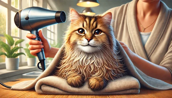 ドライヤーの音や風を嫌がる猫には無理強いしないで、暖かい部屋でタオルドライを続け自然乾燥させます。