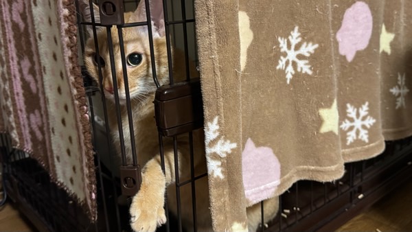 トイレの砂はひっくり返す、ゲージの中を飛び回る、目隠しの布を噛んで引き込む、出せー!と鳴き止まない……。