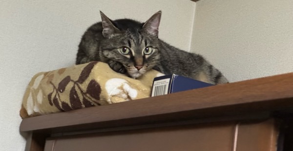 そんな様子を見ていたリクも「何かある!」と察知し、食器棚の上に避難して降りて来ない…