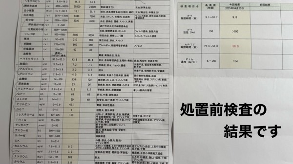 処置にあたっては全身麻酔で行われる為、まず事前に健康チェックが必要だと告げられました。
