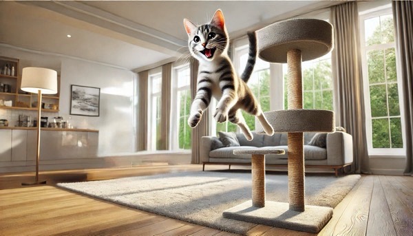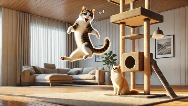 棚やキャットタワーの間に飛び移るような遊びを取り入れると、猫の運動能力が向上します。