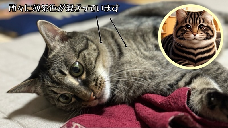 黒と茶色の縞模様で、初めはサバ虎との見分けが難しかったです。