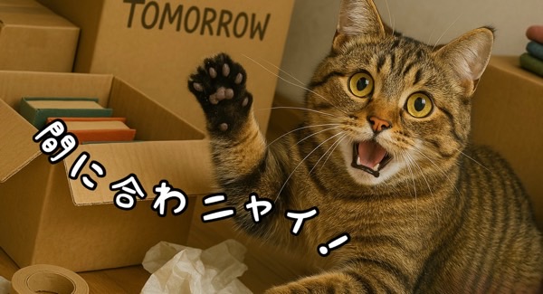 「明日引っ越しなのに準備が終わっていなくて大慌てよ。